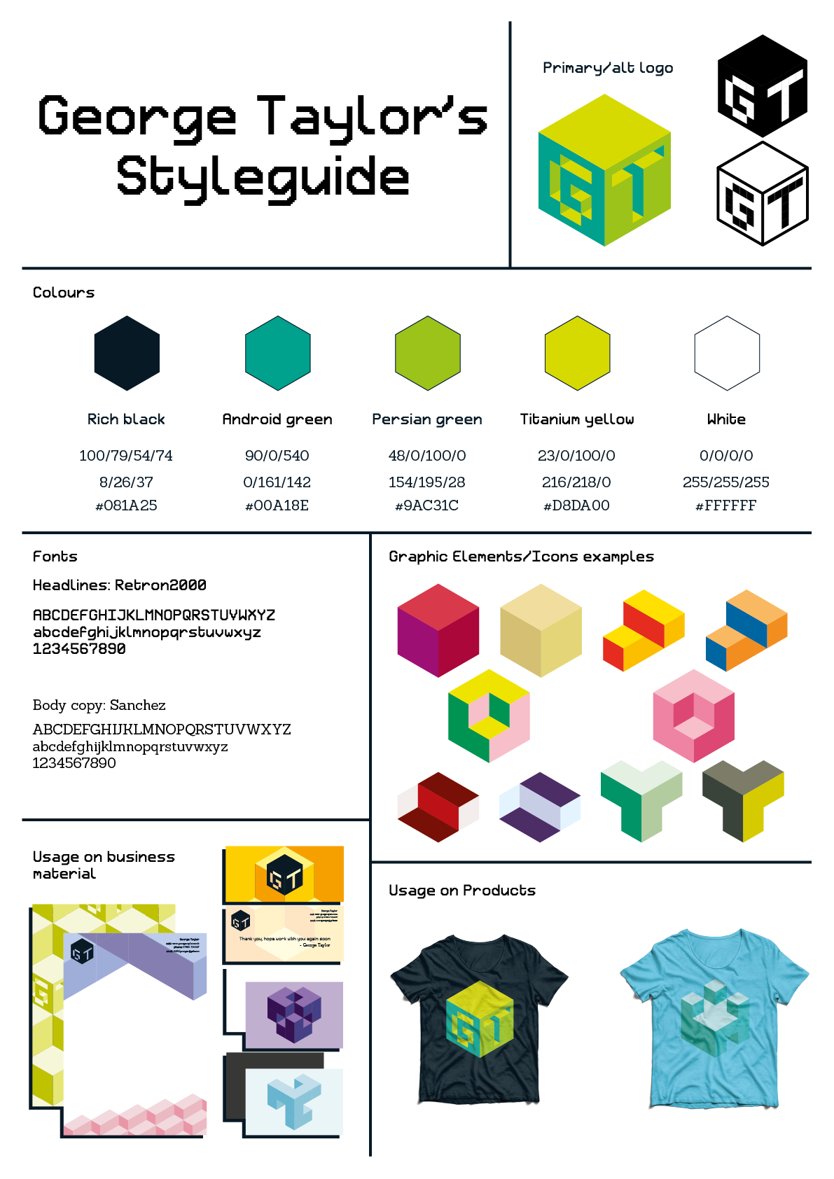 This is a styleguide made for a branding and identity assignment. It showcases fonts and key colours to be used when incorporating the branding. It also showcases isometric, cubic shapes and patterns being an essential for visual style and theming. Lastly, the styleguide showcases examples for how the branding would be used on business material or products.