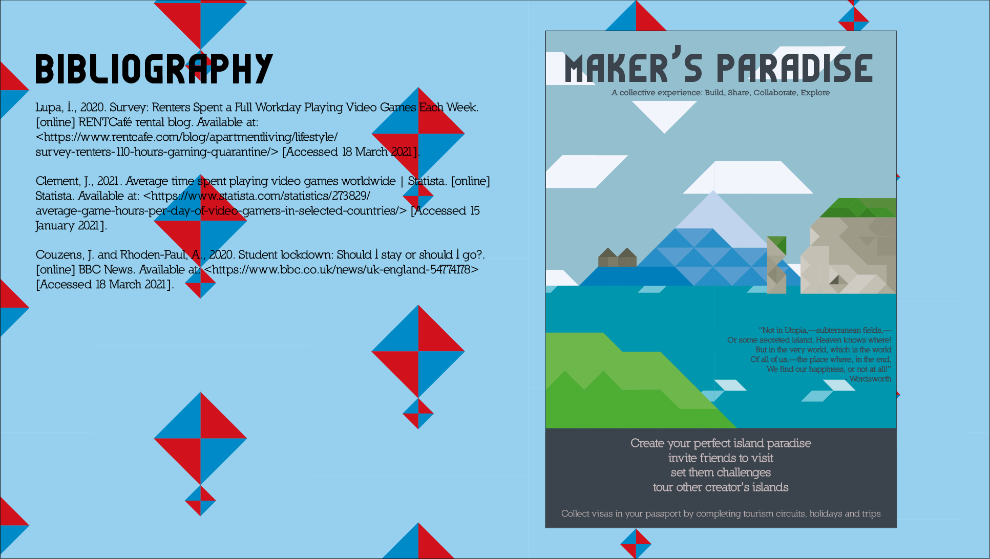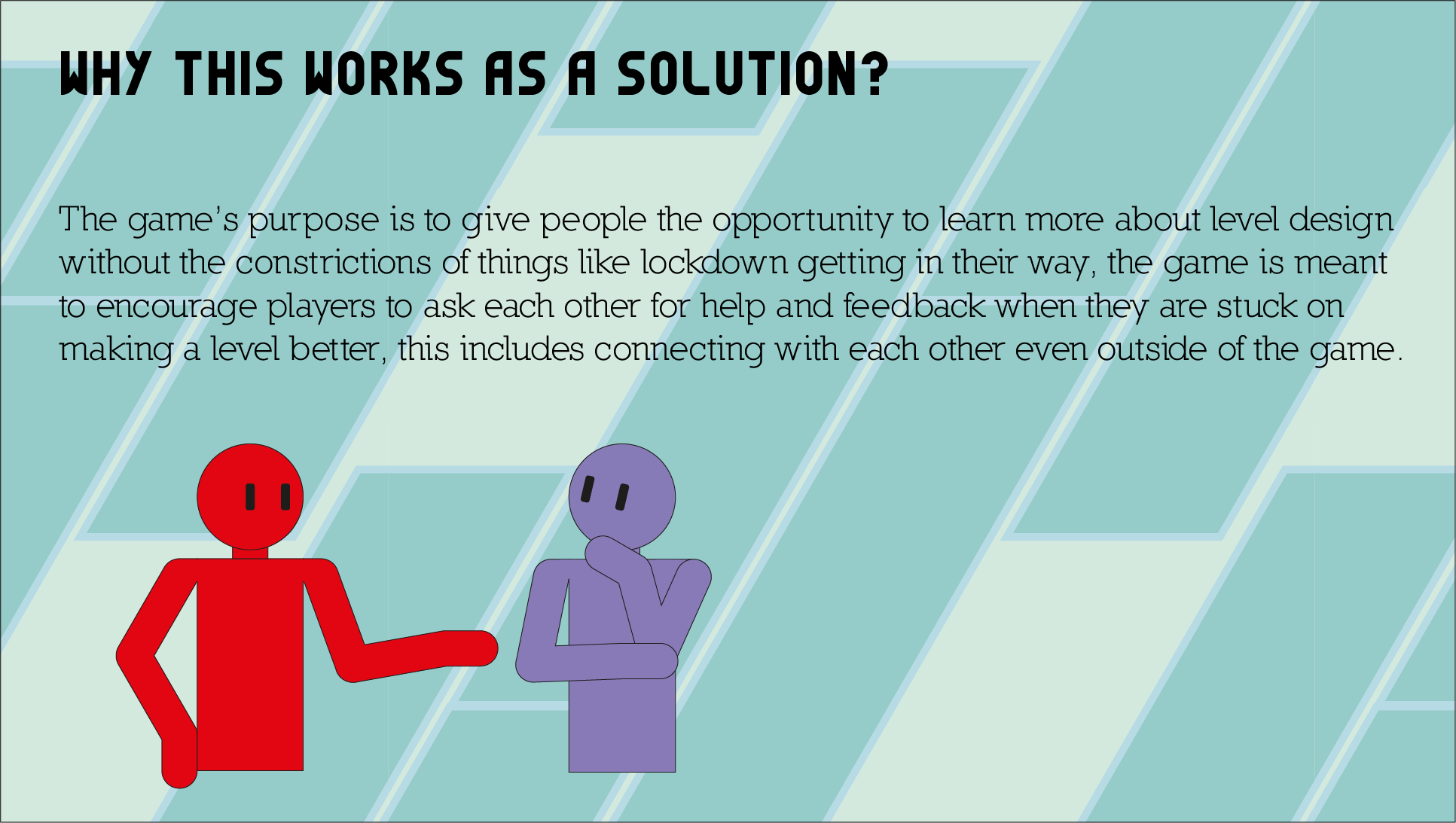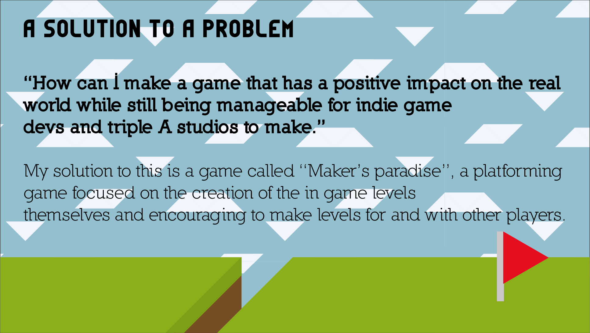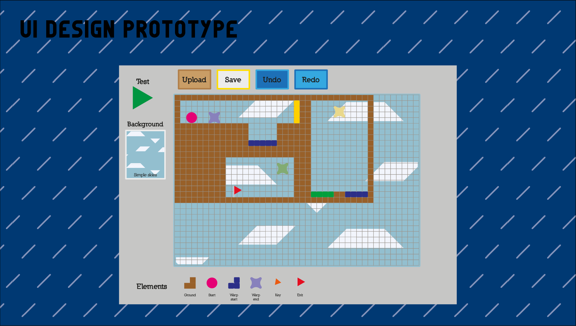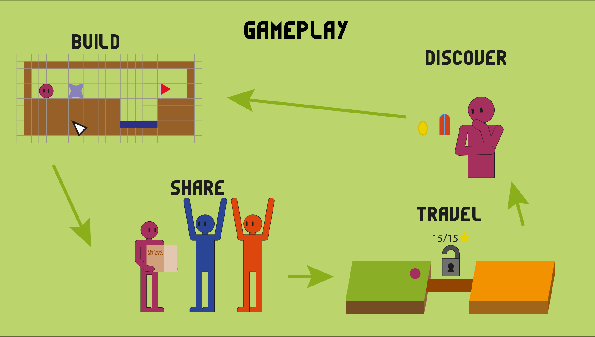 The concept for the gameplay itself was to create levels, share them with players online and unlock more features based on the more puzzles you make. Presentation slides that go into further depth are given below.